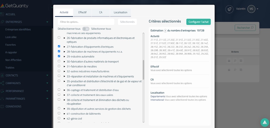 En utilisant GetQuanty, vous n'avez plus besoin d'acheter des listes d'entreprises génériques et souvent obsolètes. Notre outil vous aide à cibler précisément les prospects les plus susceptibles de devenir vos futurs clients, en s'appuyant sur des données d'entreprise et des listes d'entreprises enrichies et constamment mises à jour. Vous pouvez également découvrir des sociétés similaires à celles que vous avez déjà identifiées comme cibles, élargissant ainsi votre champ de prospects et boostant votre chiffre d'affaires.